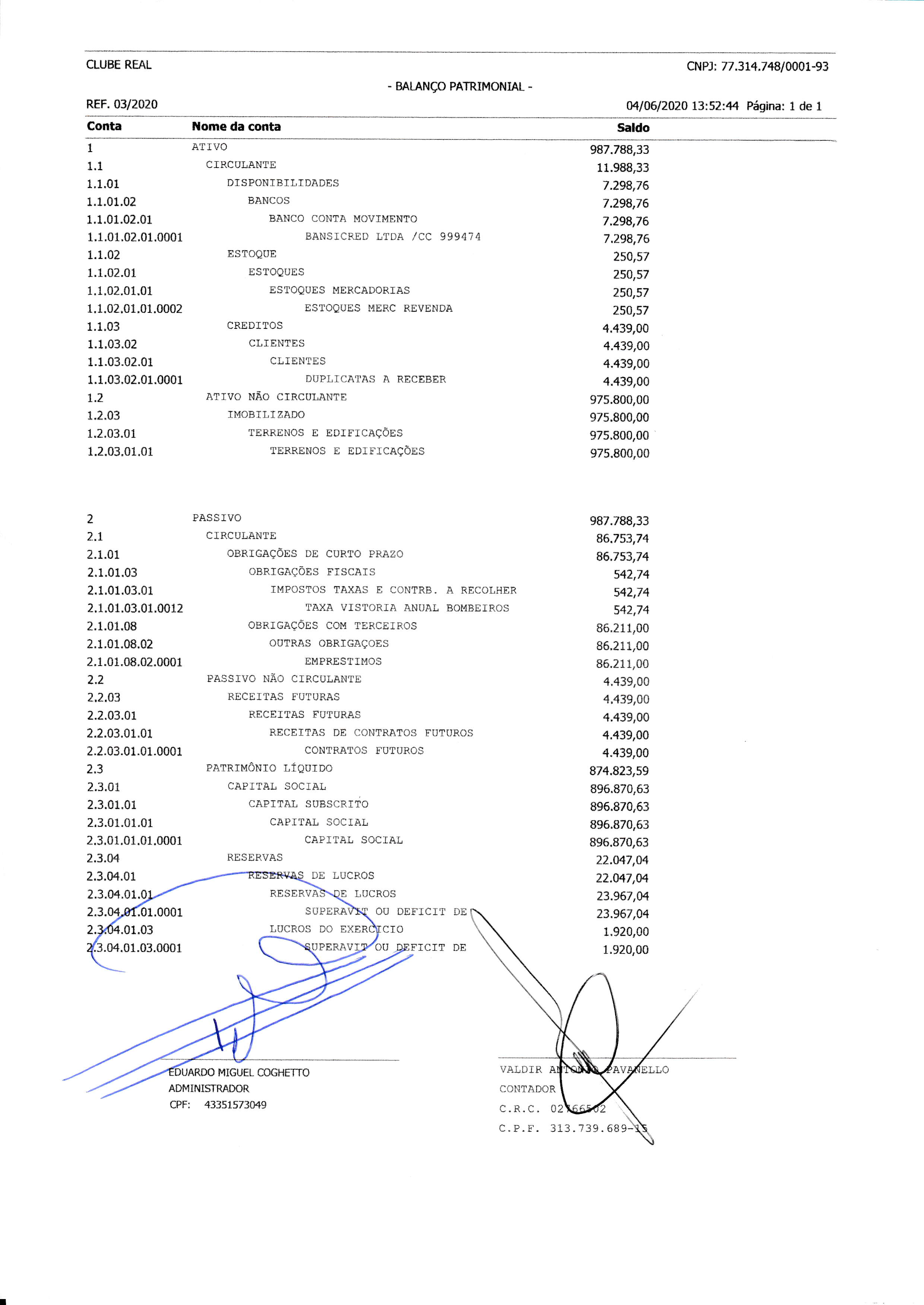 Balanço Trimestral 2020" De Janeiro, Fevereiro e Março